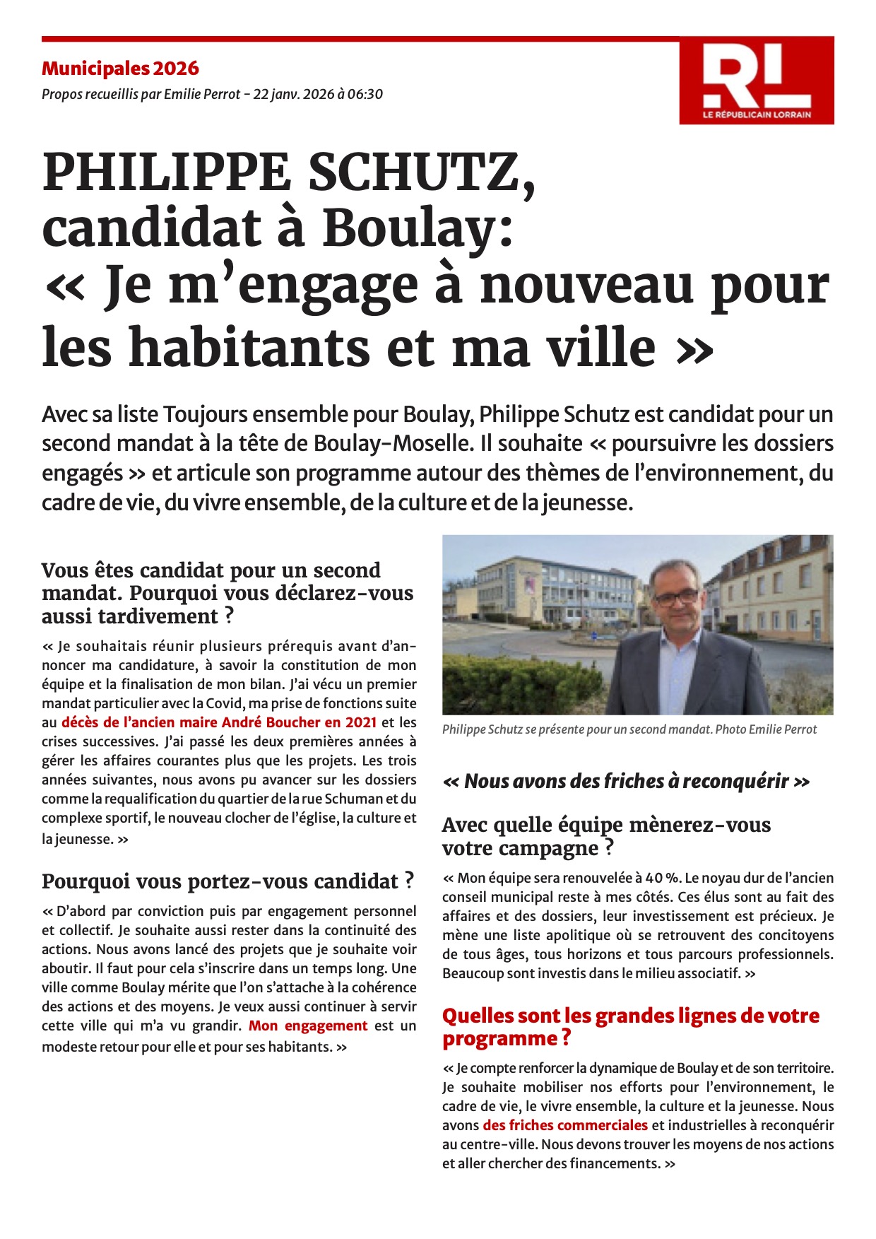 Avec sa liste Toujours ensemble pour Boulay, Philippe Schutz, maire sortant, est candidat à la tête de la commune de Boulay. Il souhaite « poursuivre les dossiers engagés » et articule son programme autour des thèmes de l’environnement, du cadre de vie, du vivre ensemble, de la culture et de la jeunesse.